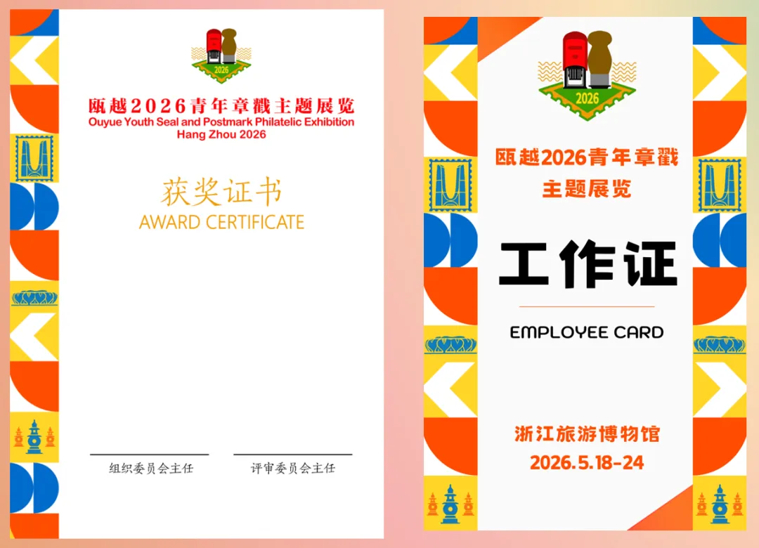 (瓯越2026青年章戳主题展览获奖证书、工作证设计图稿)