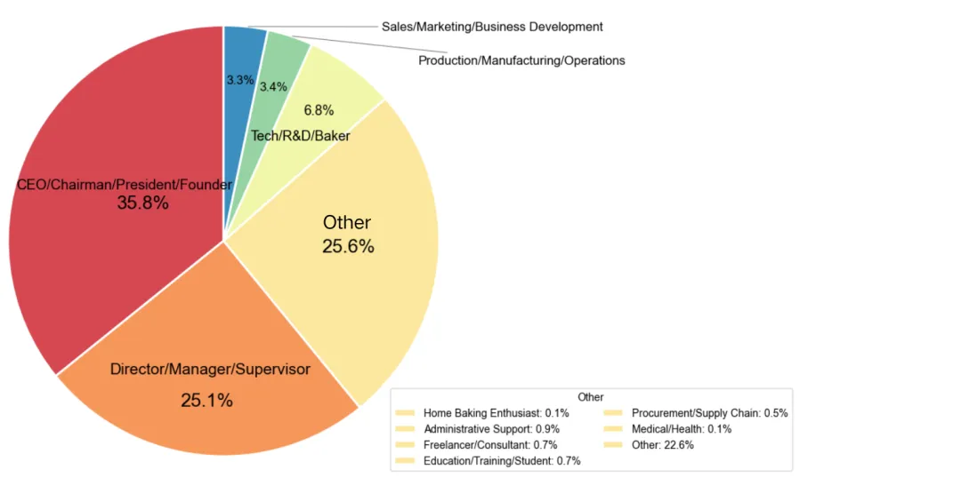 技术 / 研发 / 烘焙师(6.8%)、生产 / 制造 / 运营人员(3.4%)聚焦智能生产线升级、功能性原料研发、工艺优化等方向,适合有技术合作、产品升级服务的参展商对接。