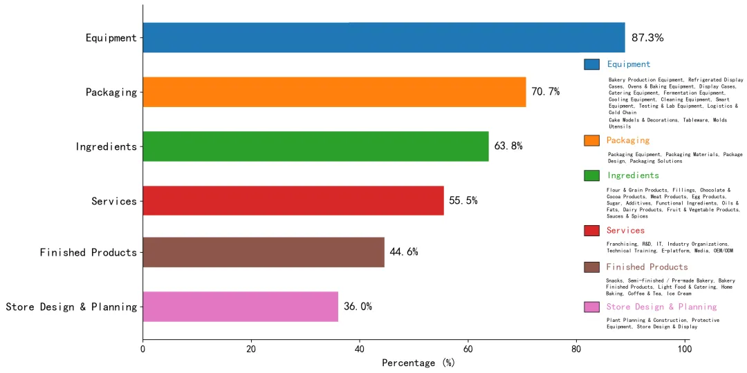 设备以 87.3% 的超高关注度稳居榜首,是全行业共识的核心采购品类。烤箱及加热设备、模具及器具(49.2%)、门店设计相关设备(36.0%)同样保持高位关注,反映出从前端生产到终端门店的全链路设备升级需求。新兴市场重点采购 “降本增效型自动化设备”,成熟市场则更倾向于具备数字化管理、智能温控、节能降耗功能的高端设备,适配不同规模采购商的升级需求。