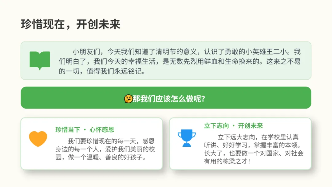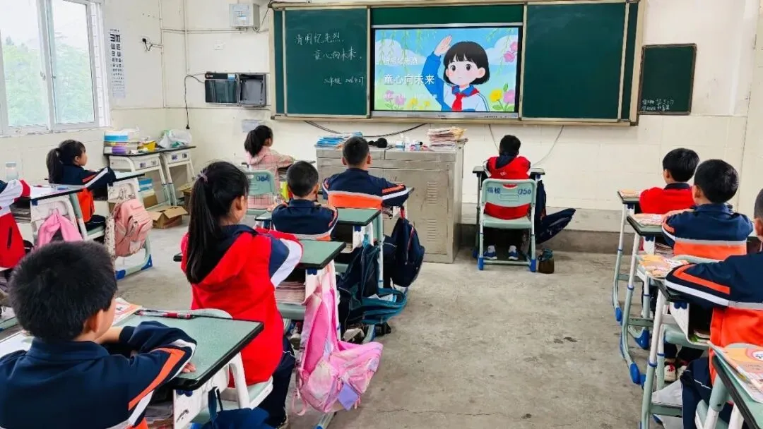 一至三年级以“清明忆先烈,童心向未来”为主题,将传统节日教育与爱国主义教育相融合。老师们通过图片和故事,向孩子们介绍了清明节的传统文化,生动讲述了王二小、雷锋等英雄事迹,引导孩子们理解幸福来之不易。在庄重的氛围中,同学们向先烈默哀致敬,懂得了珍惜与感恩,立志从小事做起,争做心怀家国的好少年。