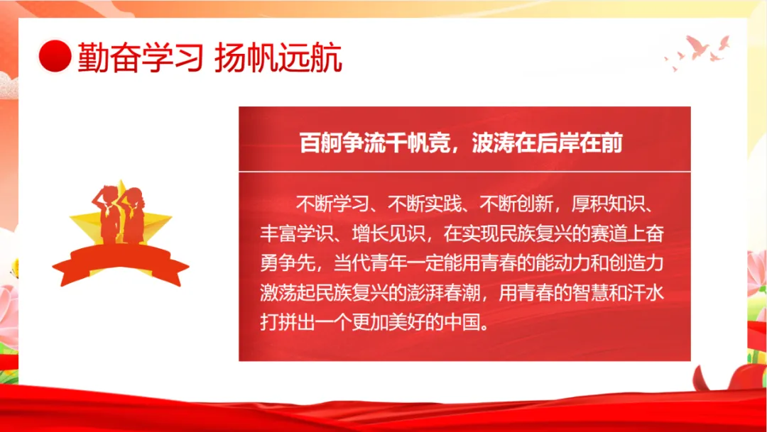 七至九年级以“唱响红色主旋律”为主题,系统回顾了中国共产党从建立、艰难探索到新中国成立的光辉历程。同学们学习了王进喜、红旗渠建设者等先辈的奋斗故事,聆听了习近平总书记青年时期刻苦学习的感人事迹,深刻理解了“红色是中华名族最鲜亮的底色”。大家纷纷表示,要勤奋学习、练就真本领,在民族复兴的赛道上奋勇争先,用实际行动践行“清澈的爱,只为中国”的铮铮誓言。