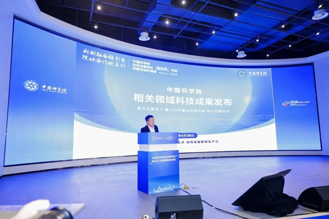4月26日下午,第四届中国(安徽)科技创新成果转化交易会专项活动——中国科学院科技成果转化“融合点”行动安徽专场对接会在中科合肥技术创新工程院成功举办。本次活动由安徽省科学技术厅、中国科学院科技创新发展局、中国科学院合肥物质科学研究院主办,中科合肥技术创新工程院与合肥市科创集团有限公司承办。中国科学院副院长汪克强、安徽省人民政府副省长任清华出席活动并致辞。