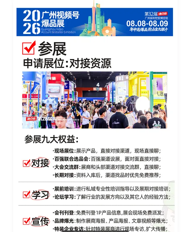 第32届广州私域博览会(沸点会)正式定档!2026年8月8日—9日,落地广州保利世贸博览馆。作为私域行业年度重磅盛会,本场展会是下半年含金量极高的专业选品展,也是商家备战金九银十、秋冬旺季、节日大促的核心对接窗口。展会汇聚千家品牌展商、万款秋冬新品与网红爆品,集结全国98%私域头部渠道,市面80%私域爆款均出自沸点会,是私域人拓渠道、选好货、冲业绩的必赴盛会!
