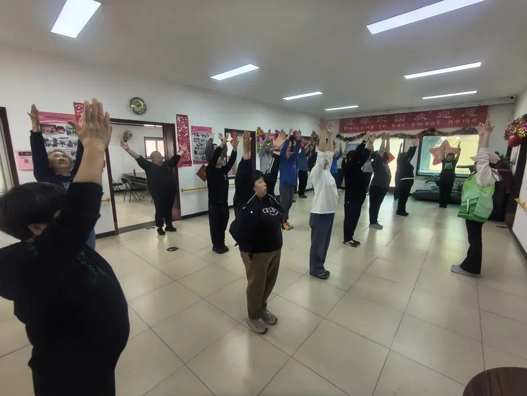 “大家跟着我,先把手臂抬起来,跟着节拍慢慢伸展……”凌老师一边喊着节拍,一边走到学员身边,逐个调整动作细节。学员们也认真投入,跟着老师的指令舒展肢体、活动关节,从一开始的略显生疏,到逐渐跟上节奏、连贯完成整套动作,脸上都洋溢着专注与快乐的神情。活动室里,明快的音乐、整齐的动作与大家的欢声笑语交织在一起,氛围轻松又热烈。