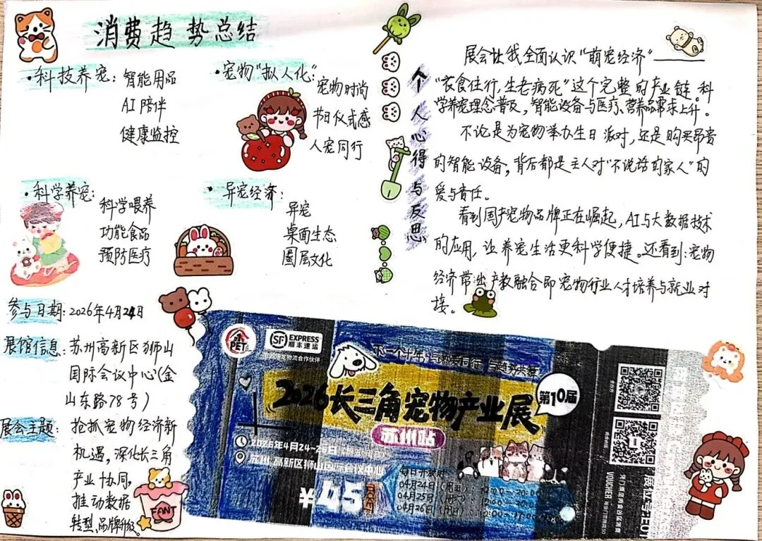展馆内,学生调研员穿梭于各大展位之间,主动向展商咨询、与一线品牌从业者对话。“请问这款智能猫砂盆的核心卖点是什么?”“目前冻干技术和传统膨化粮在消费端占比如何?”调研员们变身行业分析达人,将课堂上所学的市场调研、商品学、消费者行为分析等理论知识,与企业实际的产品策略、品类布局和营销话术一一对应。
