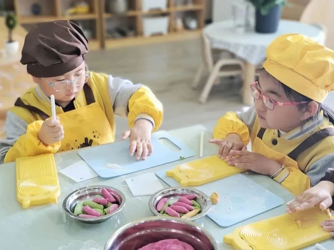 大三班的食育主题活动《一“面”之缘》在食育坊进行,小朋友有条不紊的从榨汁、和面、擀面皮到压面条,一番忙碌之后,彩色面条,空心面、鸡蛋面鱼,一份份彩色面食香味扑鼻、精彩呈现。