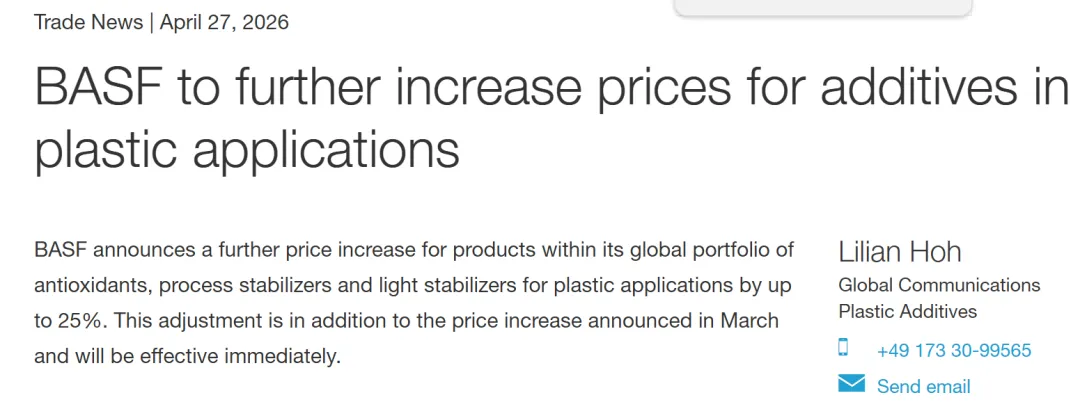 4月27日,巴斯夫宣布将其全球组合中用于塑料应用的抗氧化剂、加工稳定剂和光稳定剂产品价格进一步上调,最高涨幅达25%。主要是由于中东军事冲突导致原材料价格、能源和物流成本大幅上涨。