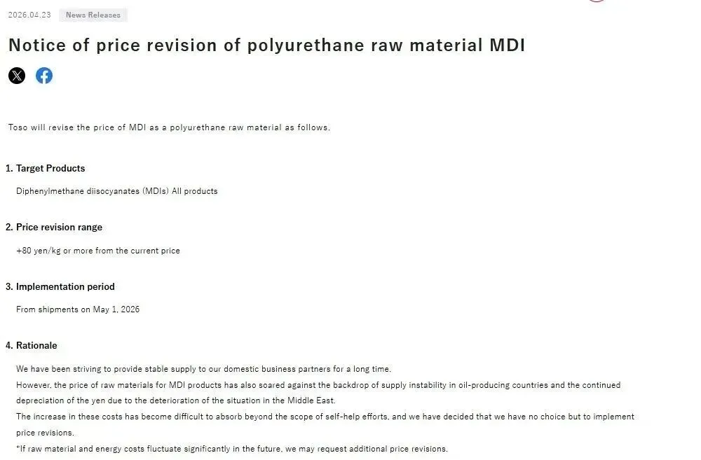 值得一提的是,4月23日,日本东曹株式会社宣布,自2026年5月1日起,旗下MDI系列产品价格将上调80日元/公斤以上(相当于500美元/吨以上)。