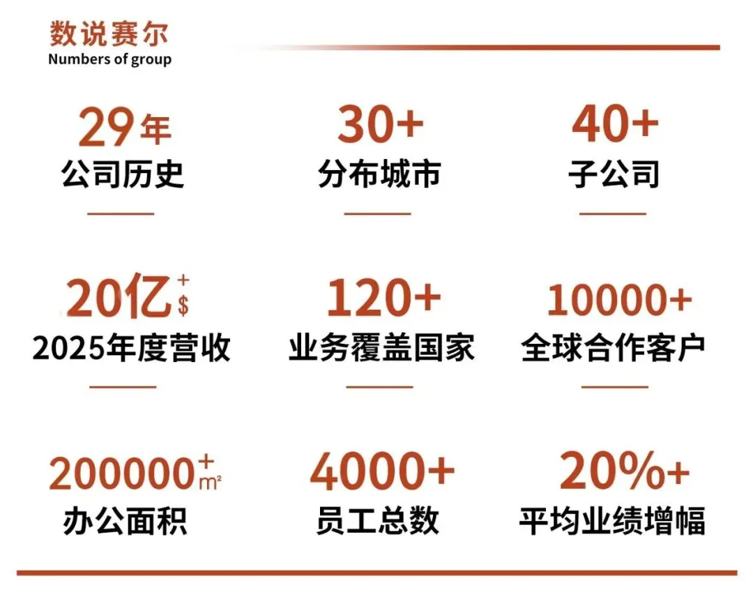 赛尔集团始创于1997年,经过29年的探索与演进,逐步发展成以日用消费品出口供应链为业务基本盘,以跨境电商出口为主赛道,并围绕专业系列产品出口、高端消费品进口、国际物流、商务会展、定制旅游、数字营销、品牌运营、国内贸易、海外仓、化工出口、新能源、智能物联、宠物食品工厂、双循环数字生态园区等外贸生态圈综合布局的集团公司。