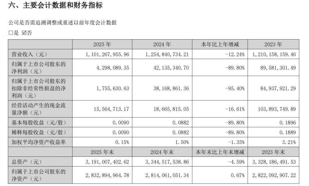 4月27日,天佑德酒(002646)交出了一份堪称近年最差的年度成绩单:2025年公司实现营业总收入11.01亿元,同比下降12.24%;归母净利润仅429.81万元,同比暴跌89.80%……