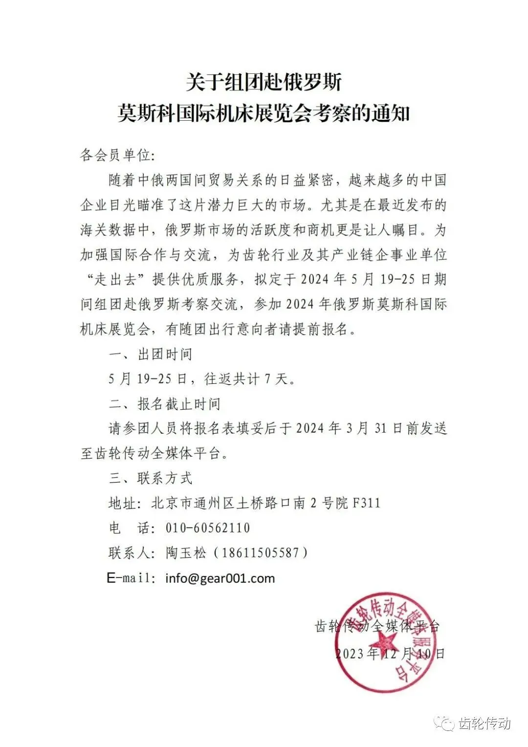 随着中俄两国间贸易关系的日益紧密,越来越多的中国企业目光瞄准了这片潜力巨大的市场。尤其是在最近发布的海关数据中,俄罗斯市场的活跃度和商机更是让人瞩目。2023年前11个月中俄贸易已突破2000亿美元;为加强中俄企业间的国际合作与交流,为齿轮行业及其产业链企事业单位“走出去”提供优质服务,拟定于2024年5月19-25日期间组团赴俄罗斯考察交流,参加2024年俄罗斯莫斯科国际机床展览会,有随团出行意向者请提前报名。