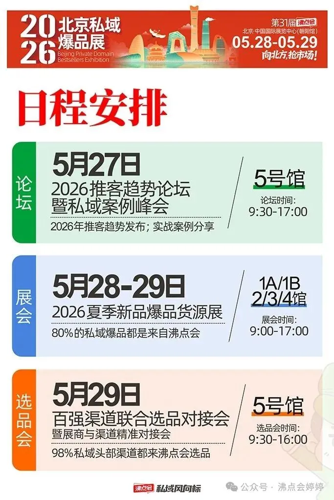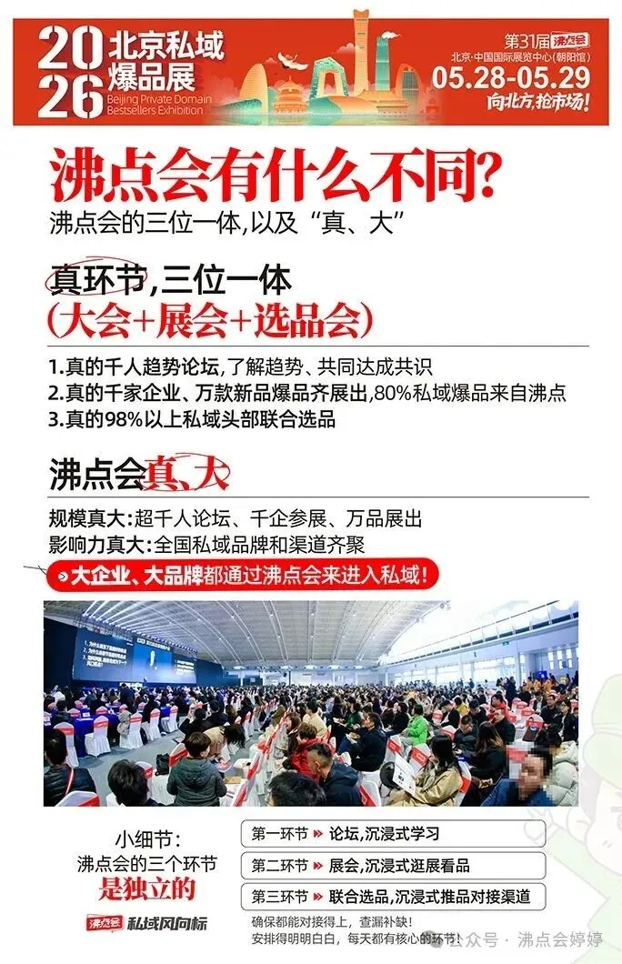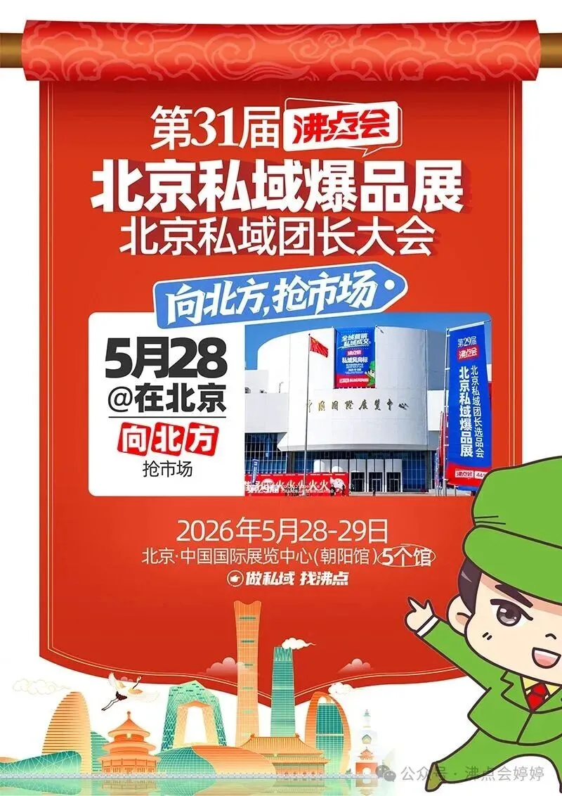 2026 年 5 月 28 日 - 29 日,北京・中国国际展览中心(朝阳馆),第 31 届沸点会北京私域展览会,汇聚全行业私域力量,打通供需对接壁垒,助力每一位从业者掘金北方私域蓝海,实现生意新增长!向北方,抢市场,做私域,这场盛会定不能错过!