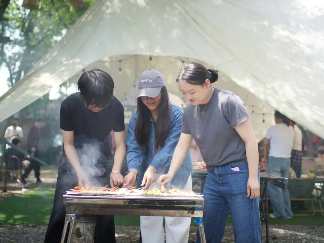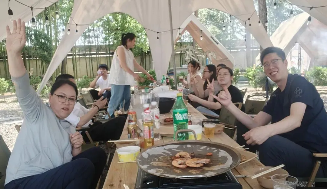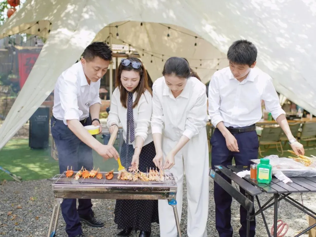 美味制作环节堪称"厨神争霸赛",大家分工明确、配合默契——有人专职"火候掌控",有人负责"灵魂撒料",还有人自封"试吃评委"穿梭其间"监工"。自助烧烤区更是欢乐主场,炭火刚起,"烧烤大师"们便各显神通:有人炫耀独门翻面绝技,有人因烤焦的"黑暗料理"引发全场爆笑,还有人举着滋滋冒油的"得意之作"四处"求夸"。烟火缭绕中,工作的疲惫随着笑声消散,团队的温度随着炭火升温。