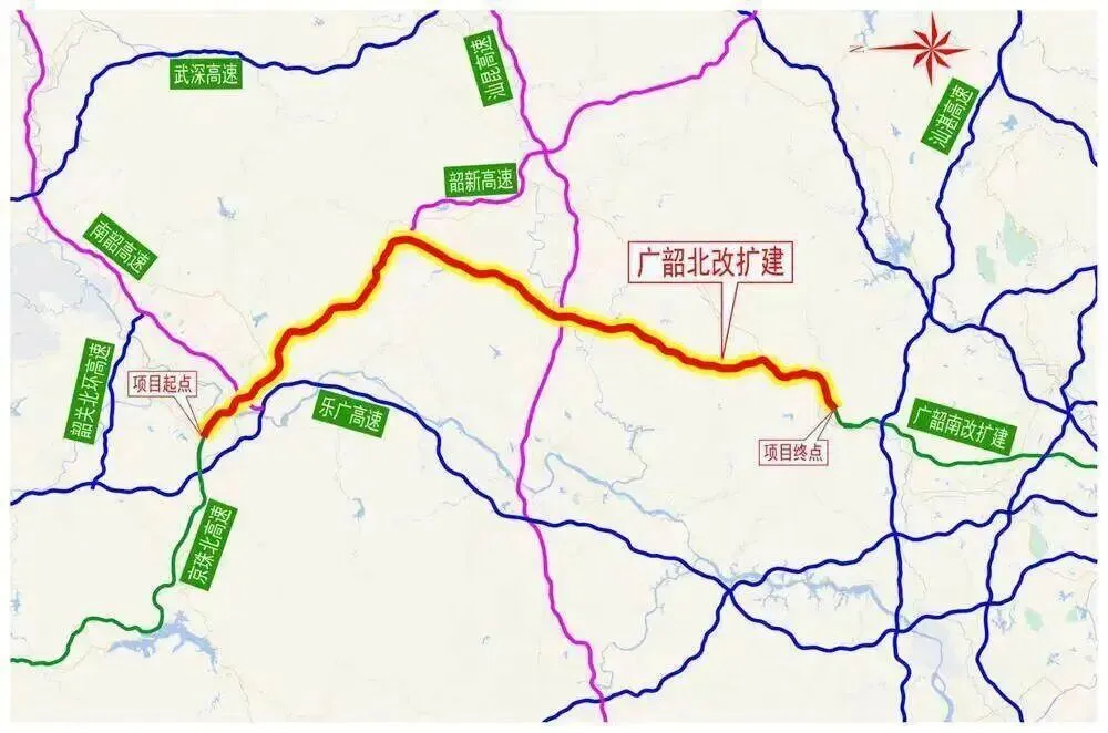 京港澳高速公路粤境韶关武江至清远佛冈段改扩建工程(即“广韶高速北段改扩建项目”)起于韶关市武江区西联镇,终于清远市佛冈县石角镇,全长125.6公里。全线设桥梁123座、隧道4座、互通立交12处、服务区3对,计划于2029年全面建成通车。