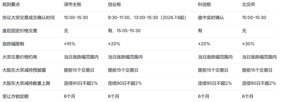 这套规则体系的完整样貌,可以从以下几个关键维度来理解:申报类型:不止一种“大宗交易”。大宗交易的申报体系包含三种类型——意向申报(买卖双方先向市场表达交易意向,寻找潜在对手方,不直接锁定成交)、成交申报(买卖双方已商定好价格和数量,直接向交易所系统提交成交确认,即最常见的协议大宗交易模式)、固定价格申报(以指定的固定价格进行申报,交易对手方可以针对该价格进行响应成交)。日常讨论的“折价大宗交易”,绝大多数都是成交申报模式下的协议大宗交易。核心特征:互为指定对手方。协议大宗交易的买卖双方互为指定交易对手方,协商确定交易价格及数量,交易所系统仅进行成交确认,不参与价格发现——这正是大宗交易容易产生信息不对称的根源。交易对手在成交前已经互相确认,定价过程是私密谈判的结果,而非公开市场博弈。一条关键的锁定期约束。这是大宗交易制度中常被不熟悉该市场的投资者忽略的规则:根据证监会《上市公司股东减持股份管理暂行办法》第十四条,大股东通过大宗交易方式减持股份,股份受让方在受让后六个月内不得减持其所受让的股份。这一规定的根本目的在于防范“绕道减持”——防止大股东通过大宗交易将股份转让给关联方,再由关联方在二级市场立即套现。六个月的锁定期,切断了接盘方“今日买、明日卖”的通道,也使得买方在定价时不得不将资金锁定半年的机会成本纳入谈判。这正是折价交易在制度层面的合理支撑之一。减持数量也有硬性上限。同样根据《减持管理办法》第十四条,大股东通过大宗交易减持,在任意连续90个自然日内,减持股份总数不得超过上市公司股份总数的2%。这一上限与锁定期形成了双重闸门:前者控制减持节奏,后者防止接盘方立即套现。此外,大股东通过大宗交易减持前,还需在首次卖出股份的15个交易日前向交易所报告并预先披露减持计划,每次披露的减持时间区间不得超过三个月。行情计入规则:不计入即时行情。大宗交易虽然纳入每只证券当日的总成交量和总成交金额统计,但不纳入即时行情和指数计算。盘中股价K线并不会因大宗交易而产生瞬时跳动——大宗交易的信号效应主要通过心理锚定和市场解读传导,而非通过盘中交易系统直接施压。参与者门槛:不是谁都能参与。大宗交易系统并非面向普通散户,合格投资者主要包括保险公司、信托投资公司、合格境外机构投资者、财务公司等经交易所核准的专业机构。普通投资者如需参与,必须委托具有经纪业务资格的券商进行。各板块规则差异一览。大宗交易的基础规则在不同板块之间存在差异化安排,以下为主要差异对比:一个需要关注的规则变动(2026年最新):2026年4月24日,深交所发布《深圳证券交易所交易规则(2026年修订)》,将创业板股票协议大宗交易调整为实时成交确认——成交确认时间由原来仅有的15:00至15:30,大幅扩展为9:30至15:30,与盘中连续竞价时间同步,将于2026年7月6日起正式实施。此次调整源于原有“盘中申报、盘后成交确认”安排下,申报与成交确认时间间隔较远,交易不确定性高,可能出现单边违约撤单等情况。调整后,创业板协议大宗交易的效率将显著提升。但需特别注意:此次调整仅适用于创业板股票,深市主板(包括比亚迪在内)的协议大宗交易成交确认时间仍为15:00至15:30,并未同步修改。投资者需注意不同板块的差异化规则。二、价格规则与折价逻辑:为什么折价可以高达12.5%?