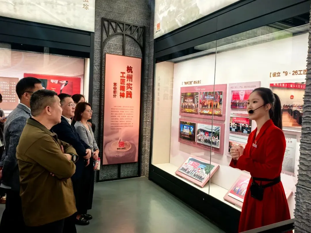 参观团队首先来到杭州工运史资料陈列馆。在讲解员引导下,大家依次参观各大展厅,回顾了工人阶级从觉醒抗争到建设改革的光辉足迹。一幅幅珍贵图片、一件件工运文物、一段段奋斗影像,生动再现了杭州工人阶级百年光辉历程。劳模工匠们驻足聆听、交流感悟,深刻体会到正是历代劳动者的默默奉献,才铸就了今日杭州的繁荣与活力。
