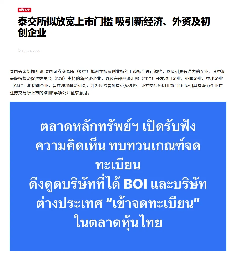近期,泰国资本市场释放出一则颇具分量的政策信号。泰国证券交易所(SET)启动新一轮上市规则修订咨询,提出放宽IPO门槛,吸引外国企业、新经济企业、中小企业及初创公司赴泰上市融资,同时为部分获得BOI(泰国投资促进委员会)及EEC(东部经济走廊)资格的企业设计更灵活的上市路径。表面上看,这是一轮资本市场制度优化;但若放在东南亚产业竞争的大背景下观察,这更像是泰国经济战略的一次升级动作。(SET Official Consultation Paper)