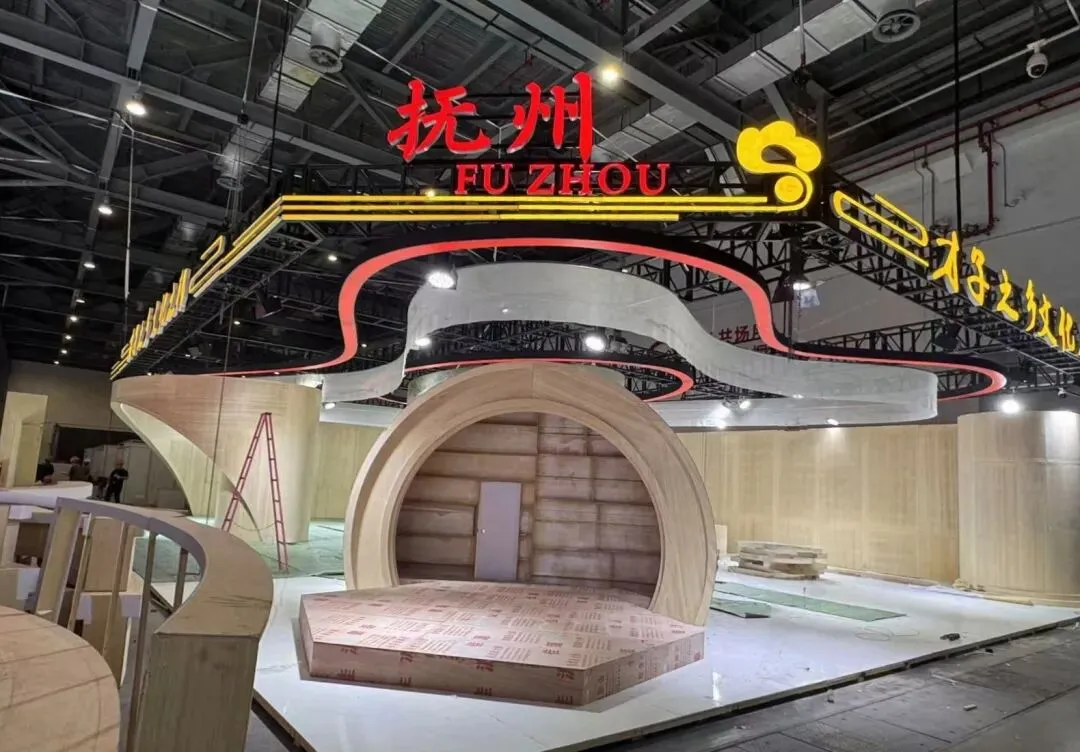 距离5月1日第二届江西文化旅游产业博览交易会开幕还有几天,南昌绿地国际博览中心内已是一派热火朝天的景象。4月28日,记者走进抚州馆探访发现,位于中心展区的抚州馆主体结构已基本完成,工人们正进行设备进馆与细节打磨等工作。一座融合水墨丹青、戏曲水袖与竹编木雕肌理的“活态抚州”馆,正从图纸走向现实。