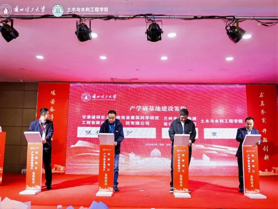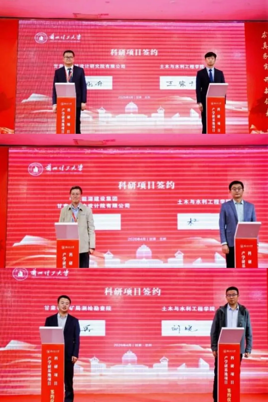 在项目合作签约仪式上,副院长樊新建代表学院,与甘肃建研岩土工程有限公司、陕西省建筑科学研究院有限公司、兰州市水电勘测设计院有限责任公司签订产学研基地建设协议;学院教师与甘肃省建筑设计研究院有限公司设计二院、中国能源建设集团甘肃省电力设计院有限公司、甘肃省地矿局测绘勘察院测绘工程技术中心等签署科研项目合作协议。