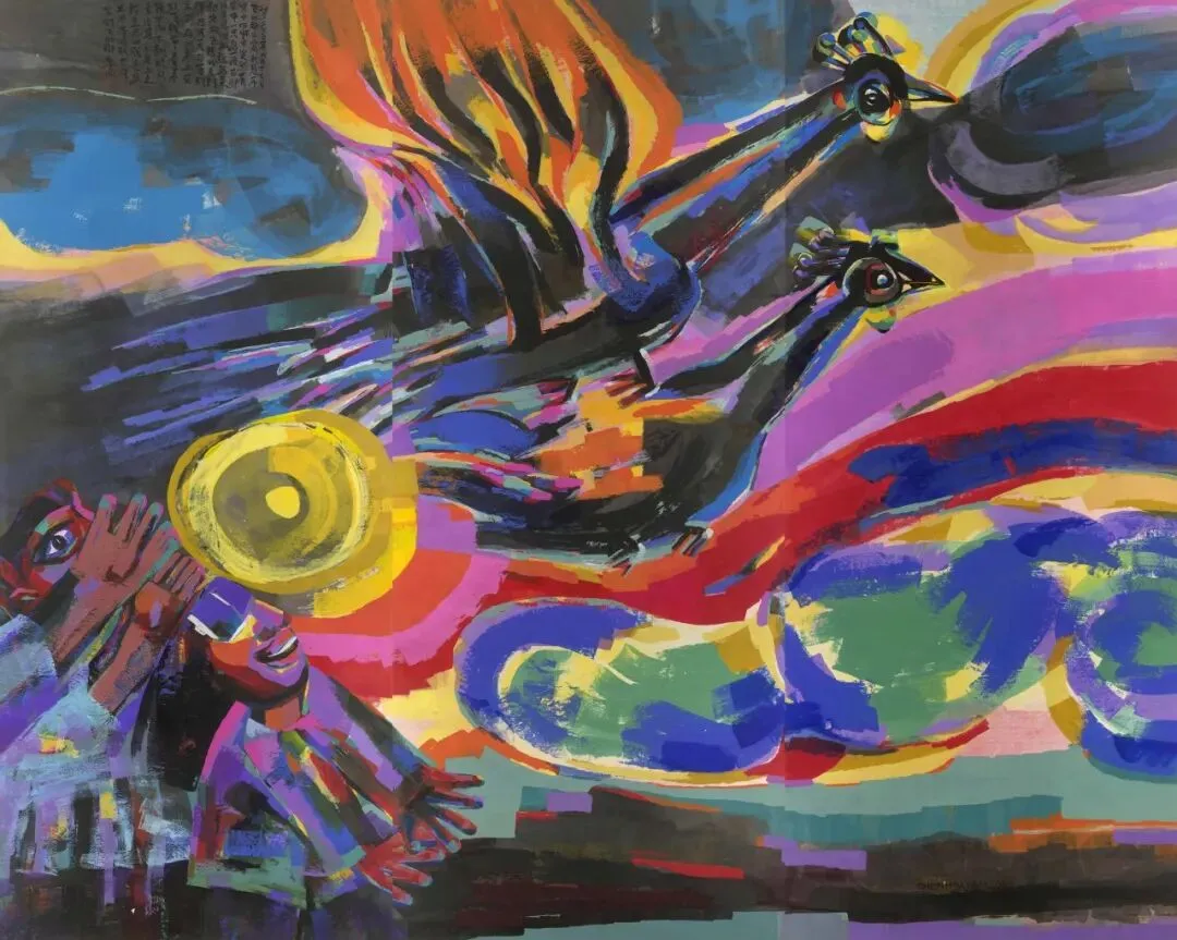 进入新世纪,陈海燕开始了她的大型绘画。在纸本上、在榉木板上,她大笔挥洒。《梦2001年5月24日·鹤女孩》,那仙鹤裸着双腿,与梦者相拥。二十多年的梦境已然为她打 开了一片无尽的天地。她要飞,她要在彩墨天地里飞。《梦2001年12月25日·风的话》中,黑色的笔触如风卷拂,有方有圆。“天似穹庐,笼盖四野。天苍苍,野茫茫。”海燕身 上的某种洒脱,从刀刃变成排列挥洒的线条,成了她反复读取的“风的话”。在《梦2001年9月24日·花盆底下的洞》中,她还以典型的木刻的方式,展现了她与芦荟花盆的奇遇。那兔子、那猴子、那些精灵都在倏然变化。她在笔记本中记录了这箴言一般的梦境。一系列涌生的惊悚故事推动着她,她身不由己,她万不得已,她要乘风而飞。在《梦2003年6月21日·看青龙》中,她看“一公一母粉绿色青龙在上下舞动”,而在画幅中,在暖色的背景 上,高高飞起的正是她自己。她画的不是梦的情节,而是发端于梦的情绪、梦的惊叹。《梦2003年4月13日·鱼变成鸟了》中,那追风少年如魔术师般在幻变,那人眼与鸟眼的交集,最能体现梦的荒诞性与真实性,最能闪现人性的悸动和光芒。这如风而动的挥洒,这鱼和鸟 的生动变迁,这荒诞的真实性,成了真正的梦,真正地在内心激情中生发出来的梦。