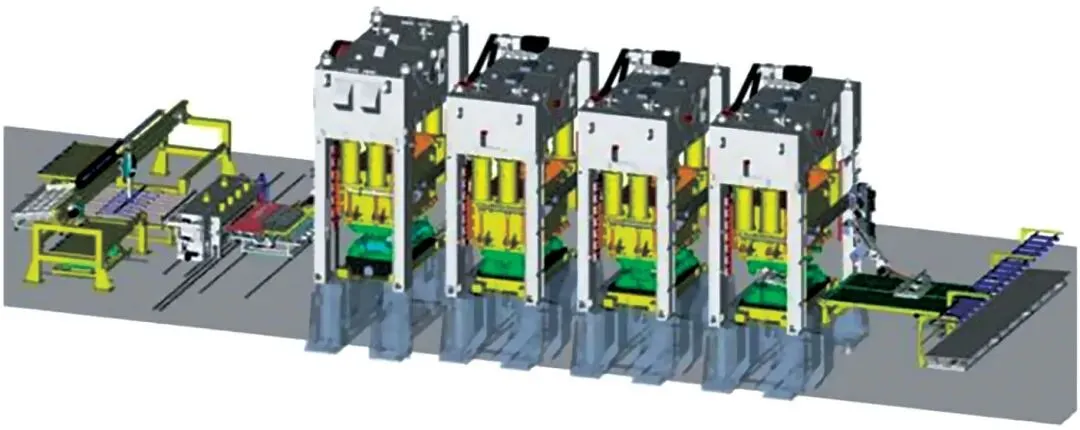 高柔性全自动冲压生产线主要由冲压设备、物料输送系统、质量检测系统和生产管理系统四个部分组成。如图1所示,冲压设备是生产线的核心,通常包括多台压力机和配套模具。这些设备能够根据生产需求快速切换,实现不同产品的生产。高柔性生产线通常采用模块化设计,便于设备的维护和升级。