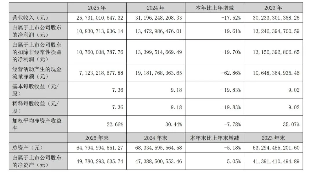 4月28日,泸州老窖(000568.SZ)发布2025年年度报告,2025年,公司实现营业收入257.31亿元,同比下降17.52%;实现归母净利润108.31亿元,同比下降19.61%。公司拟向全体股东每10股派发现金红利44.17元(含税),合计拟派发现金红利65.02亿元(含税)。