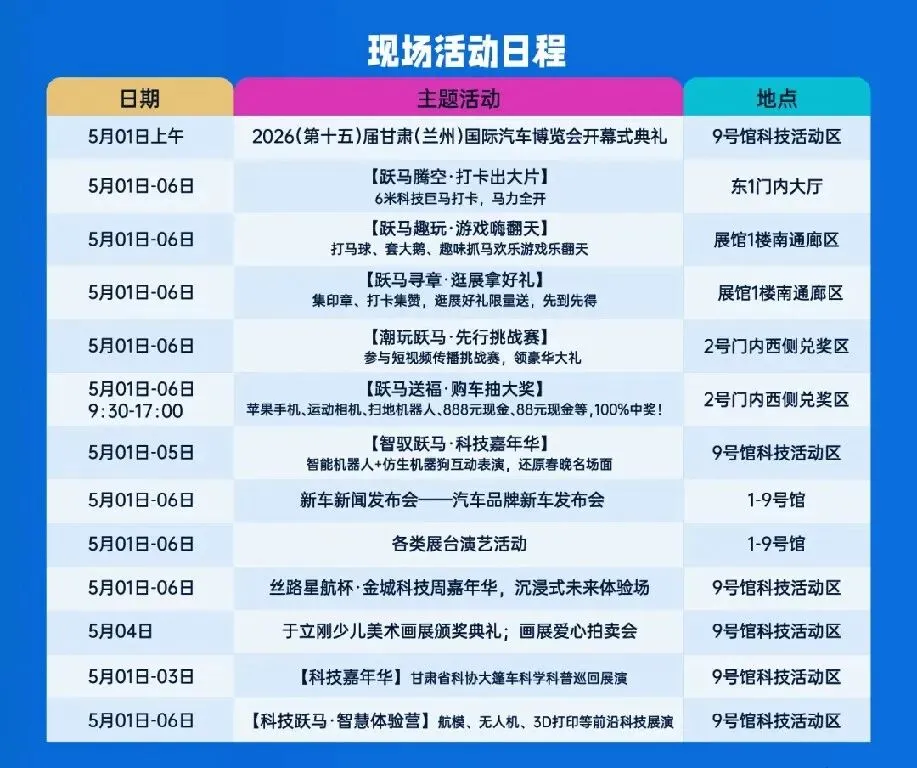 2026兰州五一国际车展5月1日-6日盛大启幕,把亲子遛娃、潮玩打卡、超值买车一次性安排明白。