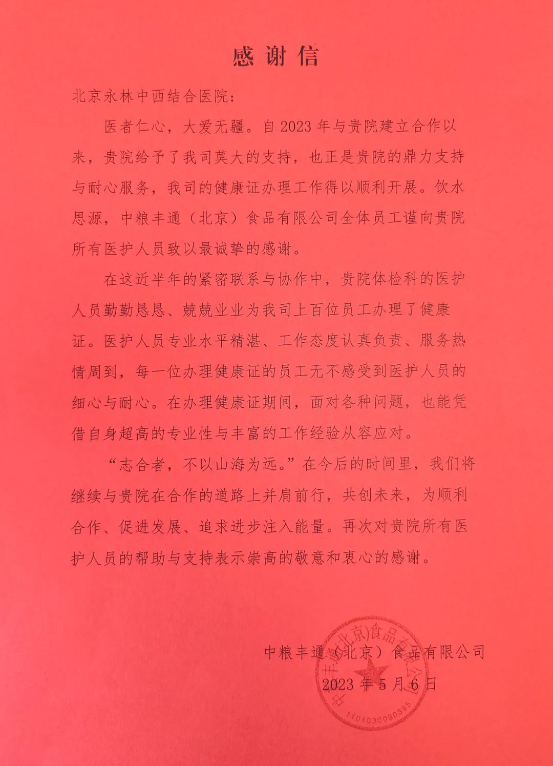 5月15日上午,中粮丰通(北京)食品有限公司一名工作人员热情的将一封感谢信送到我院从业人员健康体检部负责人崔柳手中,对该部门在为其公司100余名职工办理健康证工作中给与的周到热情服务表示感谢。崔主管表示,为客户提供优质的服务是医院每个医护工作者的职责和义务,对中粮丰通食品公司的认可表示感谢。