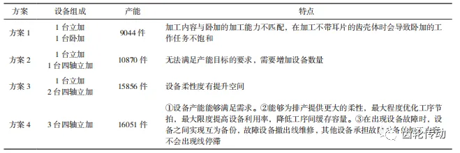 在清晰的需求及指标的约束下,进行产线整体的方案设计。首先,确定机加设备种类及规模,根据需求形成多种设备组成方案,计算各自的全年产能,分析优劣,择优选择(表1)。