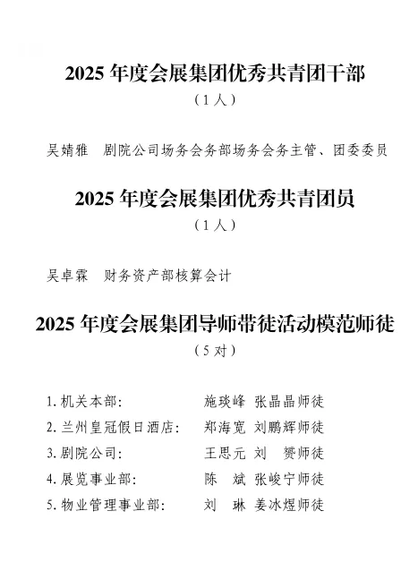 在做好集团公司荣誉争创的同时,会展集团团委同步开展内部五四评选表彰,选树一批立场坚定、作风扎实、实绩突出的青年先进典型。优秀团干部立足岗位、履职尽责,当好青年友、做好青年事;优秀团员勤学善思、担当作为,在服务保障、运营管理、营销创效一线冲锋在前;模范师徒言传身教、携手共进,以匠心传承助力青年成长成才。