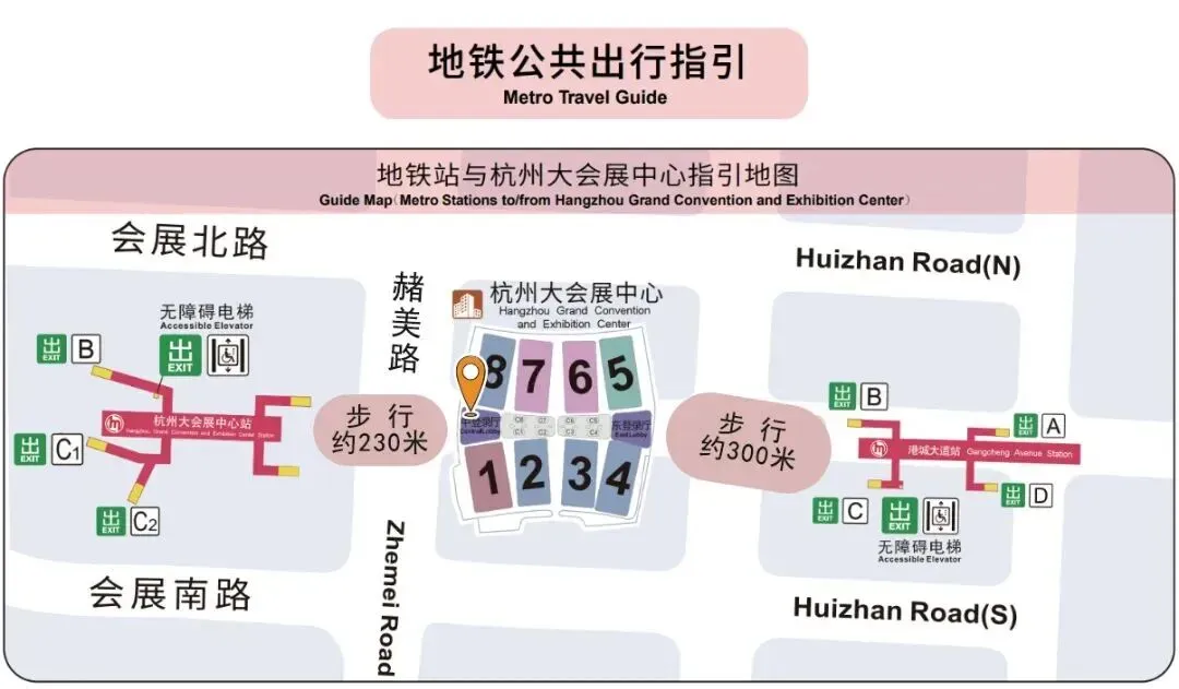 观众可乘坐地铁1号线在【杭州大会展中心站】下车,步行约230米到达大会展中心中登录厅。