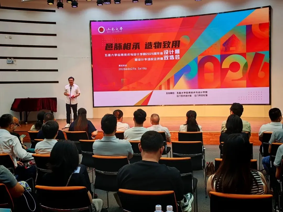 董超俊在致辞中充分肯定了应用技术与设计学院在人才培养与产教融合方面的扎实成效。他指出,本届毕业生毕业设计作品紧扣新一轮科技革命和产业变革趋势,推出一批具有鲜明时代特征的智能化设计、适老化设计、可持续设计成果,精准对标“十五五”规划建议关于“坚持智能化、绿色化、融合化”的战略部署,认真落实学校党委对应用技术与设计学院提出的“以新技术为基础、以应用为导向、以设计为核心”办学定位与发展方向,彰显了新时代设计人才培养的价值导向与实践担当。他强调,本次毕业设计展暨校企供需双选会,一体贯通教学成果、设计创意、产业需求、就业岗位,是学校创新推进“专业展览+精准招聘”就业服务新模式的生动实践与有益探索,推动学校高质量发展理念深度融入设计人才培养全过程,真正实现“学生成长成才、企业精准选才、学校提质发展、地方受益增效”的多方共赢。他寄语全体毕业生以此次活动为契机,守正创新、学以致用,把专业所学融入地方发展,以过硬本领服务江门、奉献湾区。他表示,学校将以“双优”工程为总牵引,持续坚持以服务求支持,以贡献促发展,不断深化产教融合与校企合作,优化学科专业布局,不断提升人才培养质量与社会贡献度,为江门经济社会高质量发展、为粤港澳大湾区建设提供更有力的人才支撑与智力支持。