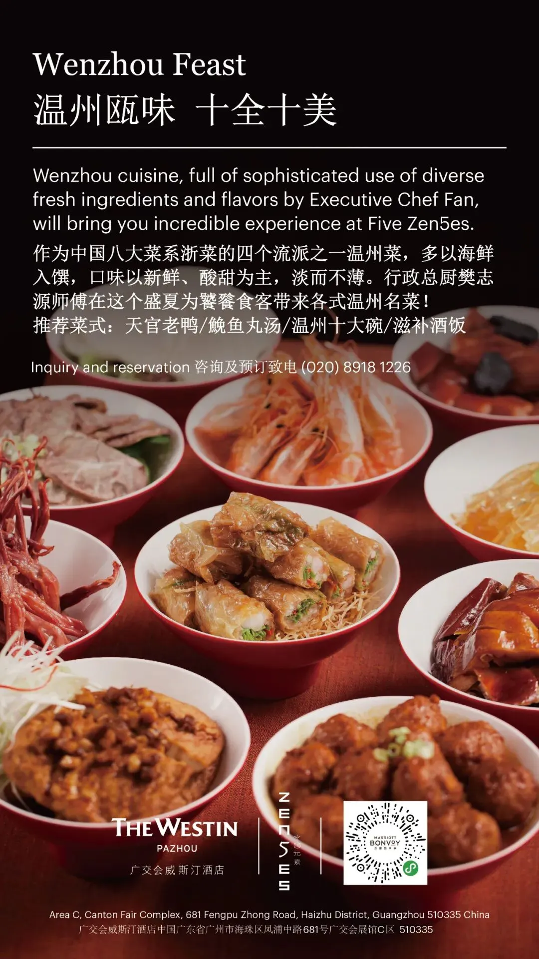 本月,广交会威斯汀酒店继续举办“温州美食节”,由酒店行政总厨樊志源领衔,为饕餮食客们于“中国元素中餐厅”推出一系列传统温州菜式,共同为您呈献温州美食文化盛宴。