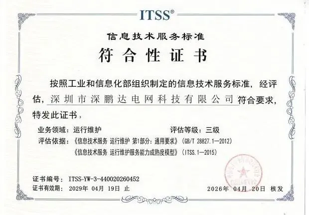 4月23日,华睿欣能集团下属深电科公司迎来重要资质突破,正式获得ITSS信息技术服务标准符合性证书(三级)。该证书由工业和信息化部、国家标准化管理委员会权威认证,是国内IT服务领域官方核心资质,具备国家级公信力与行业认可度。