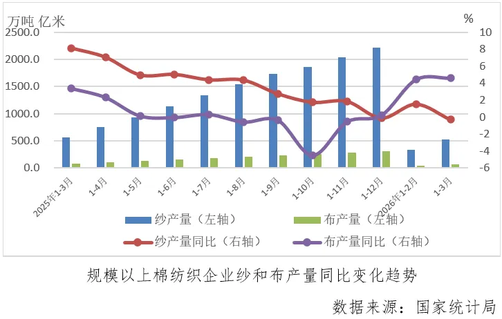 一季度,规模以上纱产量为530.9万吨,同比下降0.31%,由1-2月份增长转为下降,规模以上布产量为69.9亿米,同比增长4.61%,较1-2月份加快0.18个百分点。