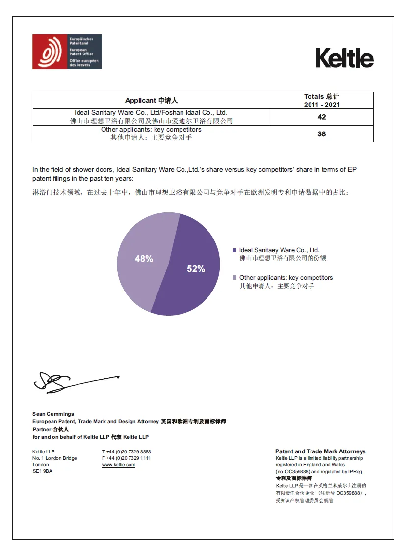理想卫浴深耕淋浴房行业31载,始终将研发投入作为战略核心,迄今为止已累计斩获1000+项专利,专利总和占欧洲主要同行专利总和的52%,构筑起坚不可摧的技术壁垒。尤其在淋浴房快速安装技术这一核心赛道上,理想卫浴掌握的核心技术数量,超出欧洲主要同行总量半数以上,占比高达62%,形成了难以逾越的技术代差优势,也正因如此,理想卫浴成为了让国际同行“既尊敬又害怕”的中国力量。