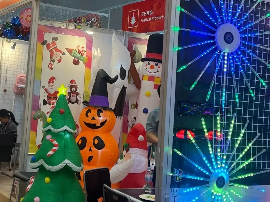 在深圳市特益峰实业发展有限公司展位,圣诞树、雪人、南瓜等气模摆件不断“招手“揽客。这些气模摆件所用到的变压器、风机和灯最近都有不同程度的成本上涨。