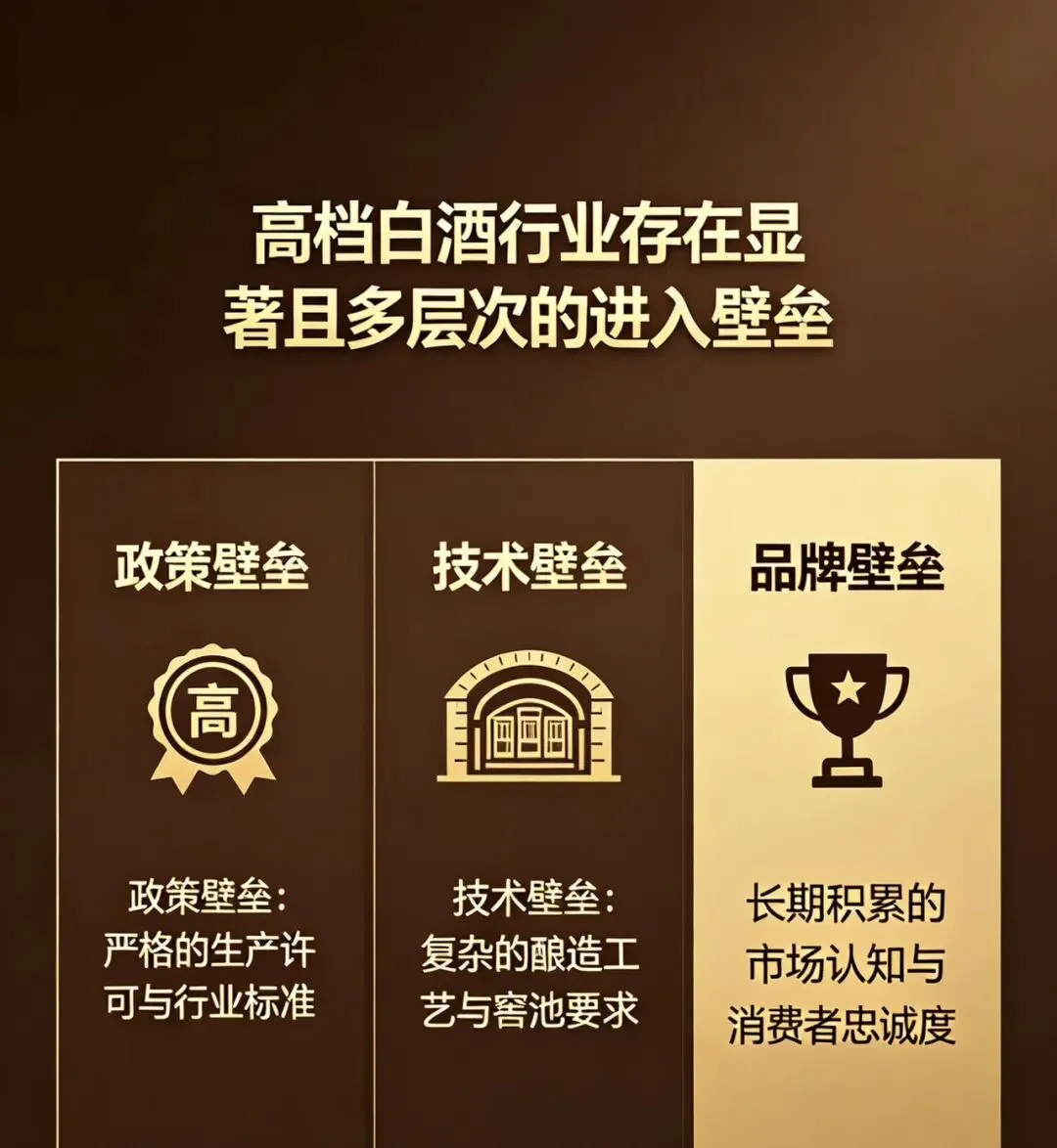 按照布鲁斯·格林沃尔德的逻辑,高档白酒行业不仅存在进入壁垒,而且壁垒种类多、强度高。具体表现为:政策与许可证构成的结构性壁垒、自然资源构成的稀缺性壁垒、传统工艺与人才构成的经验壁垒,以及品牌与客户忠诚构成的需求侧壁垒。这些壁垒共同作用,使得高端白酒市场长期呈现高集中度、高利润率的格局,新进入者几乎不可能在短期内撼动现有龙头