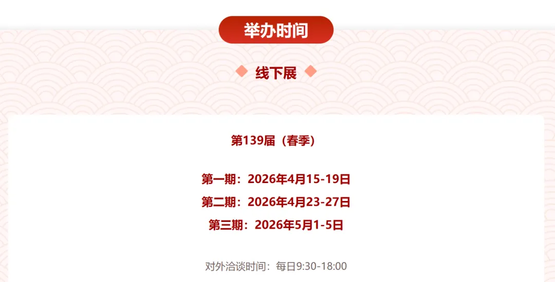 广交会全称是中国进出口商品交易会,每年春秋两季在广州举办。第139届广交会,也就是2026年春季广交会,线下展分三期举行:第一期是2026年4月15日—19日,第二期是4月23日—27日,第三期是5月1日—5日,每天对外洽谈时间是9:30—18:00,地点在广州琶洲的中国进出口商品交易会展馆。