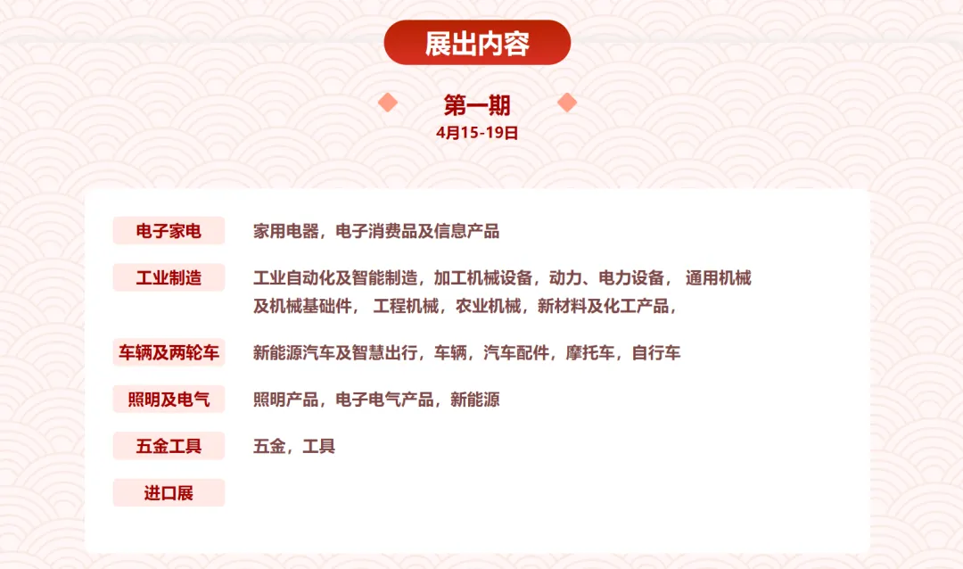 官方展出内容包括电子家电、工业制造、车辆及两轮车、照明及电气、五金工具等板块。具体来看,包括家用电器、电子消费品及信息产品、工业自动化及智能制造、加工机械设备、动力电力设备、通用机械、工程机械、农业机械、新材料及化工产品、新能源汽车及智慧出行、汽车配件、摩托车、自行车、照明产品、电子电气产品、新能源、五金和工具等。