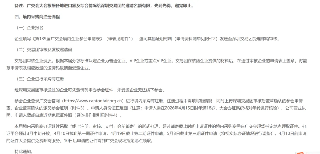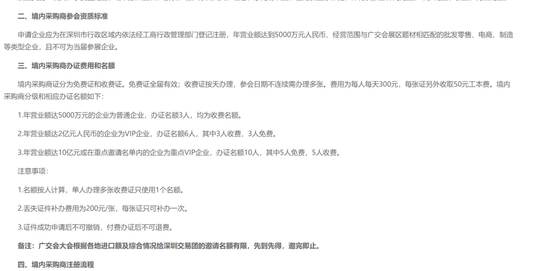 办证费用方面,公开通知中提到,境内采购商证分为免费证和收费证。收费证通常按天办理,费用为每人每天300元,另外每张证收取50元工本费;如果参会日期不连续,可能需要按不同日期分别办理。