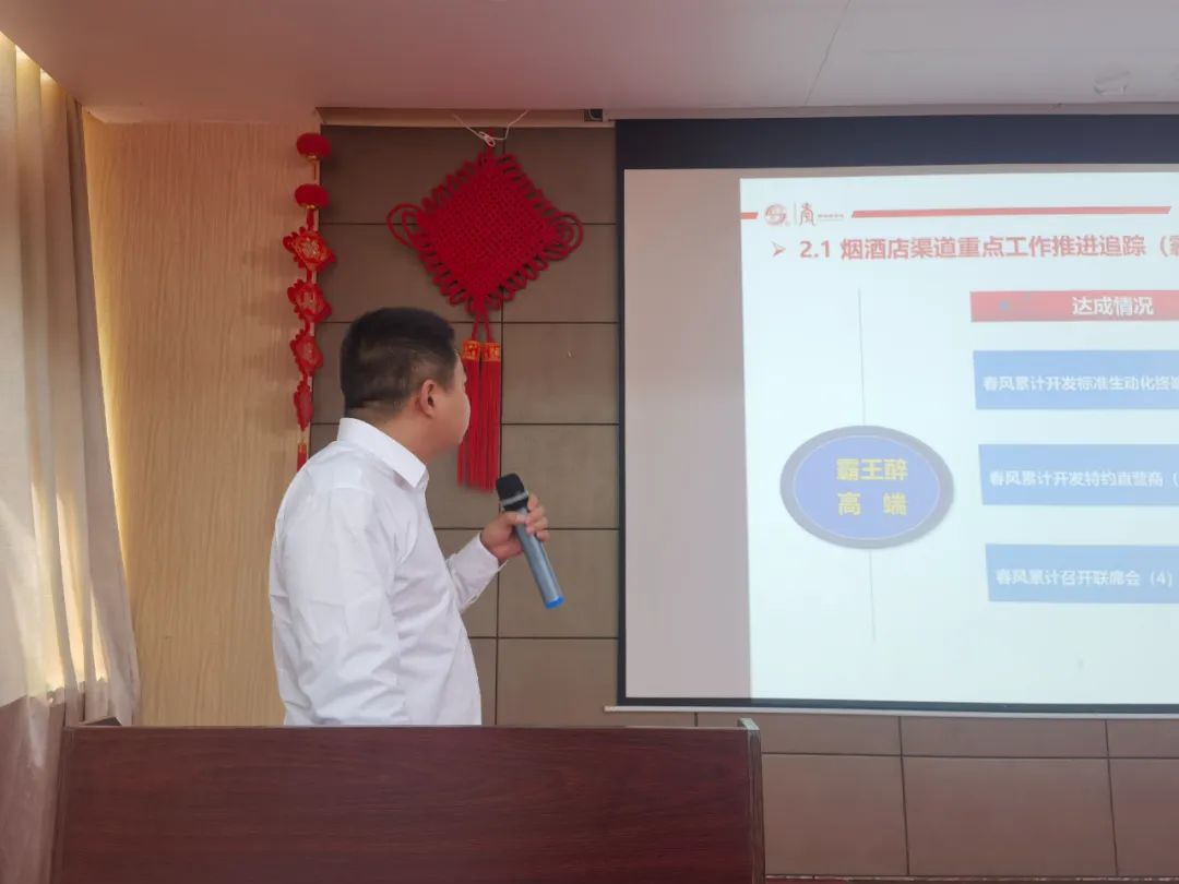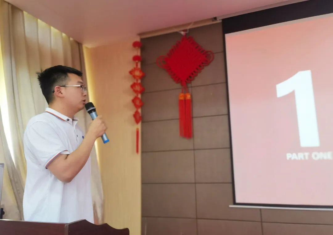 宜城区域阿米巴见习经理余少康在会上为合作伙伴们讲解了宜城区域“2022年度总结及2023春风活动总结。