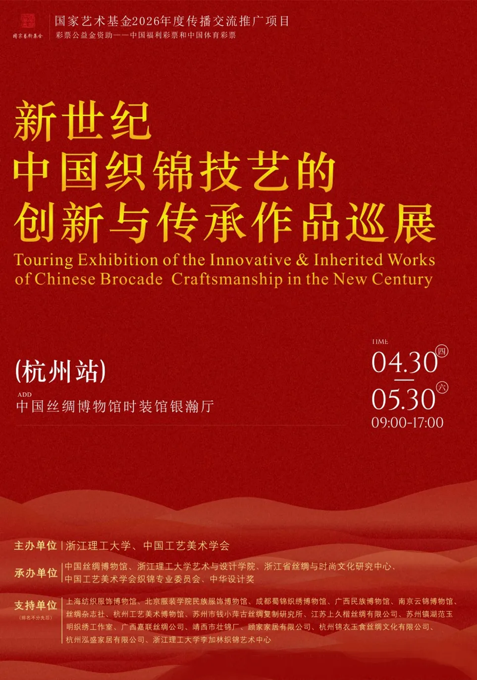本次巡展由浙江理工大学、中国工艺美术学会主办,中国丝绸博物馆等机构承办,是国家艺术基金2026年度传播交流推广项目。展览聚焦新世纪中国织锦技艺的传承脉络与创新成果,系统呈现织锦技艺在当代语境下的多元表达,带领观众领略传统工艺与时代审美的交融碰撞,感受织锦艺术跨越千年的文化魅力。