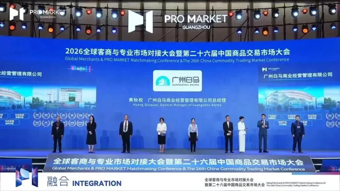 在大会设置的“市场代表转型升级表态”环节,黄秋权进一步表示:作为越秀集团旗下的专业市场运营公司,旗下广州白马服装市场是中国十大服装市场之一,也是中国著名的服装品牌孵化基地;中港皮具城获评国家级知识产权保护规范化市场与全国五星市场。企业将主动践行国企担当,响应广州市专业市场转型升级高质量发展部署,聚焦广货品牌培育、文商旅融合发展与市场采购贸易深化,同步布局悦境通跨境电商、白马智选、时尚产业综合服务三大平台,聚力构建内外贸一体化发展格局,全力打造行业标杆市场。这一铿锵有力的表态,赢得了与会全球客商与行业代表的热烈掌声。从搭建数智化平台到布局跨境电商,从原创品牌孵化到内外贸一体化,广州白马正以实际行动诠释“平台赋能、链接全球”的转型决心。