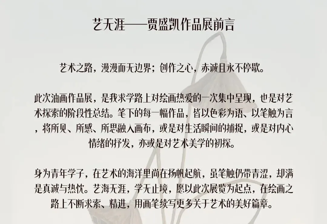 本次展览作为贾盛凯个人油画作品展,扎根于河北工艺美院的艺术沃土,是创作者阶段性艺术学习与创作成果的集中呈现。展览以“艺无涯”为核心主题,寓意艺术探索永无止境、求学之路步履不停,既彰显着青年艺术创作者对艺术的赤诚热爱,也传递出在艺术道路上不断求索、永不停歇的创作态度。