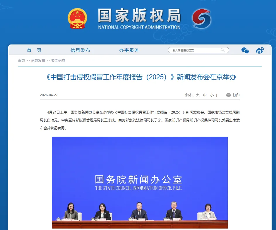 文创版权保护将纳入打击网络侵权盗版专项行动。4月24日,国新办就《中国打击侵权假冒工作年度报告(2025)》有关情况举行发布会。会上,中央宣传部版权管理局局长王志成表示,今年,计划将文创领域版权保护纳入打击网络侵权盗版“剑网2026”专项行动,在抓好网络文学、网络销售、网络存储+传播等领域侵权盗版治理的同时,重点加强对图书出版、电影电视剧、长短视频文创作品及衍生品的版权保护,严厉打击未经授权非法复制传播、生产销售侵权盗版产品的行为。