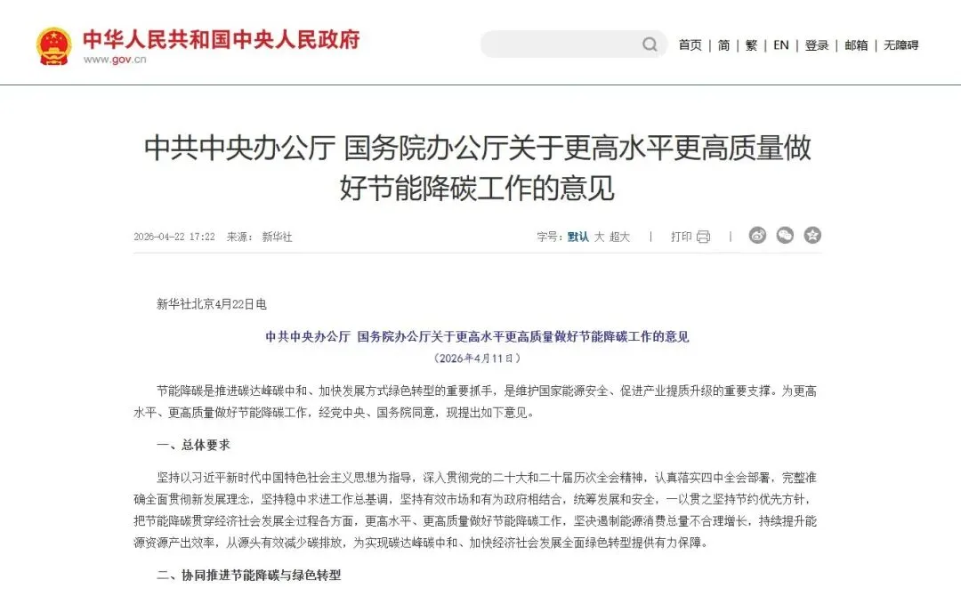 中共中央办公厅 国务院办公厅关于更高水平更高质量做好节能降碳工作的意见。4月22日,中共中央办公厅、国务院办公厅《关于更高水平更高质量做好节能降碳工作的意见》对外发布。意见要求,一以贯之坚持节约优先方针,把节能降碳贯穿经济社会发展全过程各方面,更高水平、更高质量做好节能降碳工作,坚决遏制能源消费总量不合理增长,持续提升能源资源产出效率,从源头有效减少碳排放,为实现碳达峰碳中和、加快经济社会发展全面绿色转型提供有力保障。意见从协同推进节能降碳与绿色转型、大力推进重点领域节能降碳、进一步加强节能降碳监督管理、强化节能降碳工作支撑保障等方面作出具体部署。