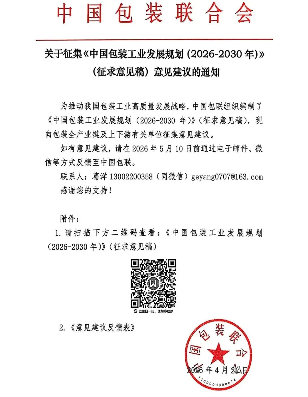 中包联公开征集《中国包装工业发展规划(2026-2030年)》意见建议。为推动我国包装工业高质量发展战略,中包联组织编制了《中国包装工业发展规划(2026-2030年)》(征求意见稿),现向包装全产业链及上下游有关单位征集意见建议。如有意见建议,请在2026年5月10日前通过电子邮件、微信等方式反馈至中国包联。根据《规划》征求意见稿的发展目标与产业规模要求,至2030年末,包装产业年总产值突破3万亿元。龙头企业能级持续跃升,年产值百亿企业发展到20家以上,50亿元以上企业不少于40家;新增上市企业8-10家,新增5-8 个具有国际竞争力的大型企业集团。企业经济效益稳步提升,形成大中小企业协同融通的发展格局。