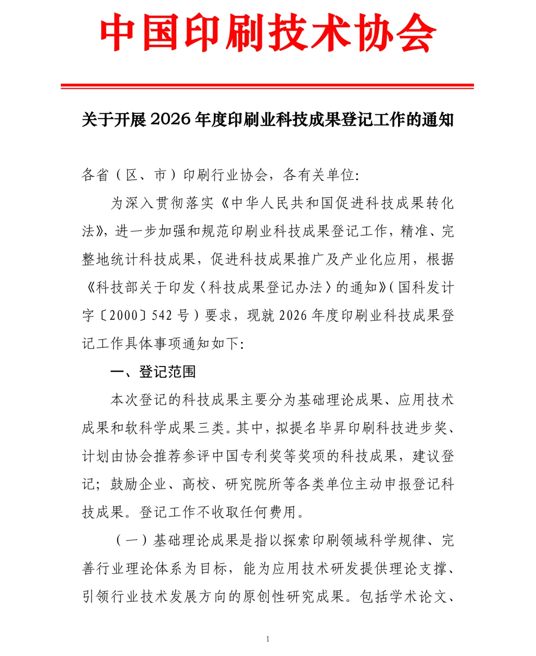 2026年度印刷业科技成果登记工作启动。为深入贯彻落实《中华人民共和国促进科技成果转化法》,进一步加强和规范印刷业科技成果登记工作,精准、完整地统计科技成果,促进科技成果推广及产业化应用,根据《科技部关于印发〈科技成果登记办法〉的通知》要求,中国印刷技术协会就2026年度印刷业科技成果登记工作具体事项发布通知。通知表示,本次登记的科技成果主要分为基础理论成果、应用技术成果和软科学成果三类。鼓励企业、高校、研究院所等各类单位主动申报登记科技成果。成果完成方需根据拟登记成果类型,按要求填写《科技成果登记表》,准备齐全相关证明材料,报送所在省(区、市)印刷行业协会进行形式审查。由各省(区、市)级印刷行业协会于7月30日前,将符合条件的科技成果申报材料电子版推荐至中国印刷技术协会。