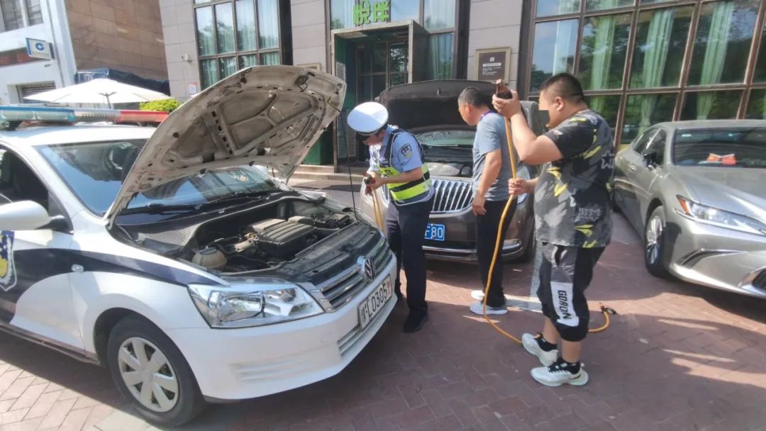 王磊听闻立刻上报中队,在附近巡逻的班长薛玉龙驾驶警车闻讯赶来,从后备箱取出便携搭电器帮助车主“搭火”启动。